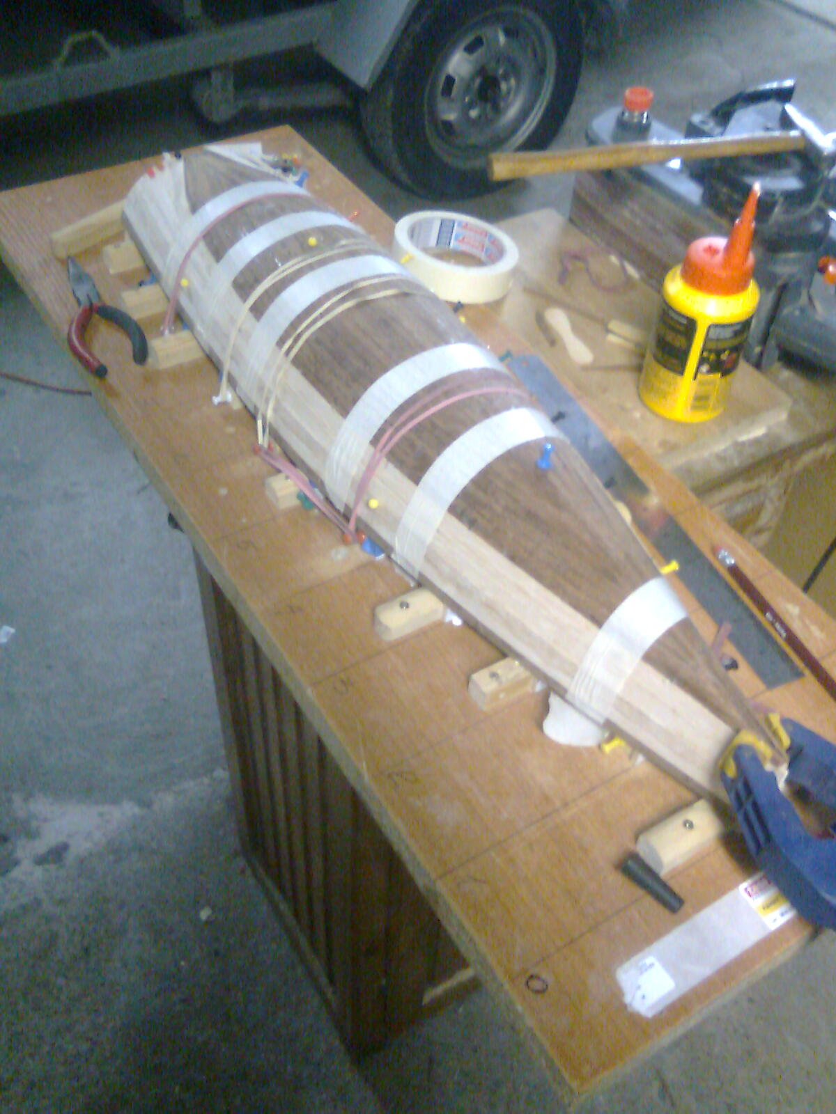 решил не заморачиваться с искривленным кокпитом,нашлась заначка шпона,как раз хватило обклеить палубу.На прицепе швертбот,470 класса