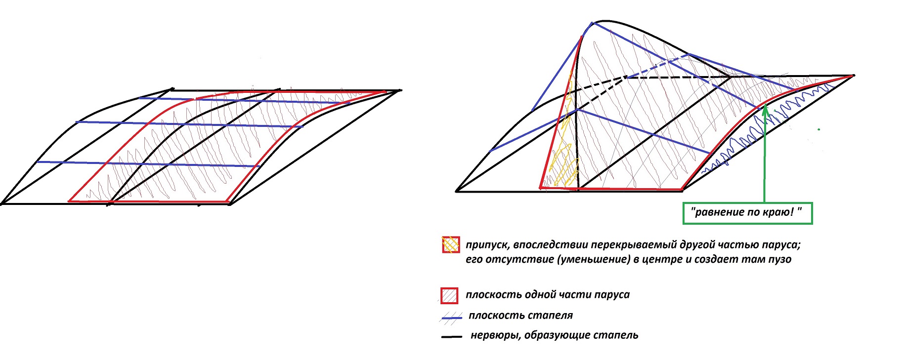 "для создания пуза, полоса соединения двух кусков паруса (где скотч двухсторонний), по краям больше внахлест, а по середине меньше" - на эту полосу соединения должны быть припуски, почему их нет на чертеже и как их тогда размечать ?