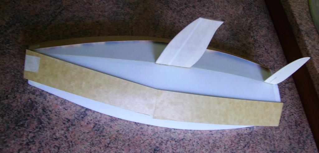 Корпус опять будет комбинированный, потолочно-картонный, грех отказываться от проверенных и удачных решений. Можно было бы сделать корпус и из «фруктовой» фанеры, прошлифовав её до двух миллиметров (друг делал из неё Jif-65 - очень хорошо получилось), но это на будущее. Поскольку гик будет очень низко, рубки не будет, короче, получится «авианосец» с совершенно ровной палубой и двумя, стоящими по оси корпуса гермовыводами шкотов. Крепление, вант, стакселя, ахтерштага будет интегрировано в корпус, гермолюк в кормовой части как на Footy, вровень с палубой, да еще он попадает в зону «окраски» скотчем, видно его практически не будет. Кстати такая нетрадиционная окраска, как на Footy, появилась совершенно не случайно, на большом расстоянии она позволяет однозначно определить ориентацию корпуса яхты, что не всегда удается сделать даже по разноцветным парусам. Гермовыводы конструктивно будут такие же как и на Footy – стеклярус в трубке от гелиевой ручки, минимальное трение при хорошей герметичности и простоте конструкции.