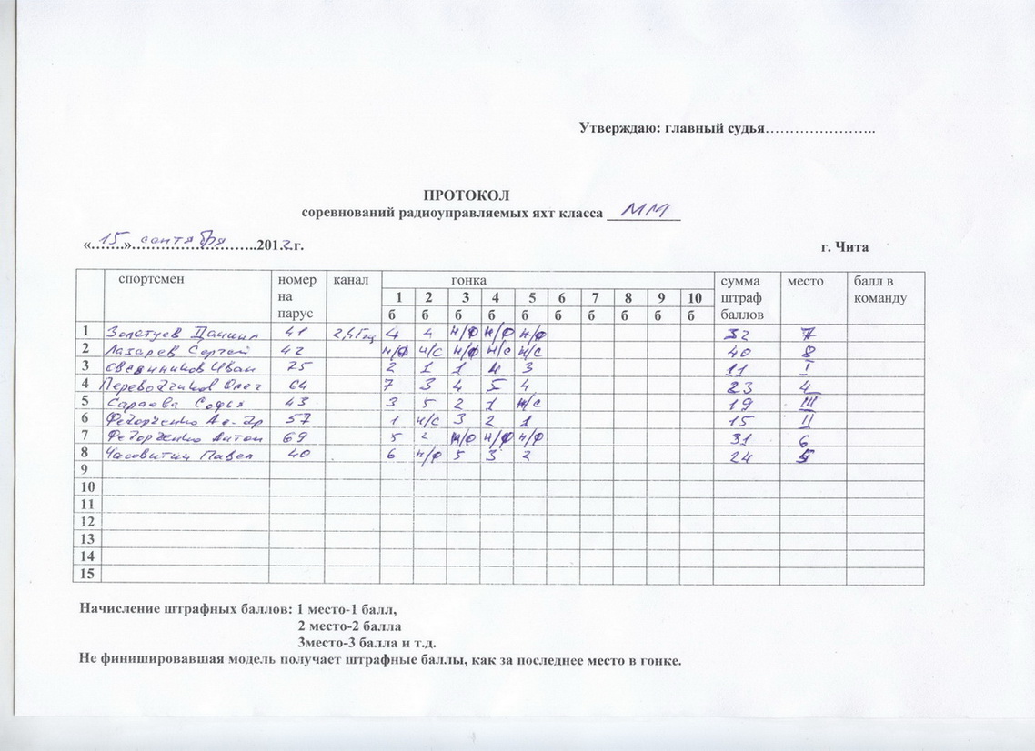 Ну вот и откатали первые в истории Забайкальского края гонки яхт класса ММ! Небольшой отчет о произошедшем. Заявилось для участия 8 человек, но фактически гонялось 7, поскольку у восьмого были еще старты в других классах моделей. Вывод-НИКОГДА более яхты не будем гонять одновременно с копиями, ЭКОшками и прочими плавсредствами. Погода нас совершенно не баловала-было весьма тепло, так что мордуленции подкоптились, но совершенно безветренно. В итоге вместо запланированных 10 гонок с трудом откатали всего 5. Результаты предоставлю в виде отсканированного протокола. Зачет вели по пяти гонкам (ввиду малого их числа). Лично я, несмотря на вполне неудовлетворительный собственный результат, очень доволен. СВЕРШИЛОСЬ!!! И вроде как есть еще желающие пополнить ряды ММ-щиков, что, несомненно, радует! Ну а тем, кому до призеров добраться не удалось, есть над чем поработать.